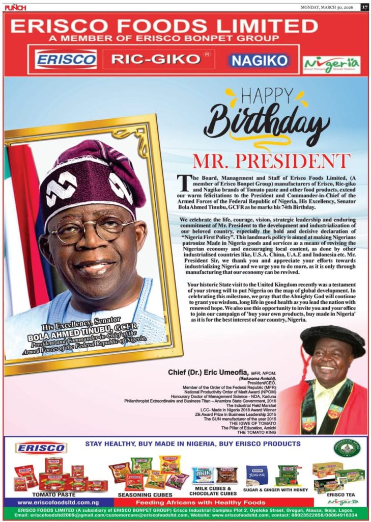Erisco Foods Ltd CEO Chief(Dr)Eric Umeofia Felicitates With The President Of The Federal Republic Of Nigeria on his 74th Birthday Celebration.
